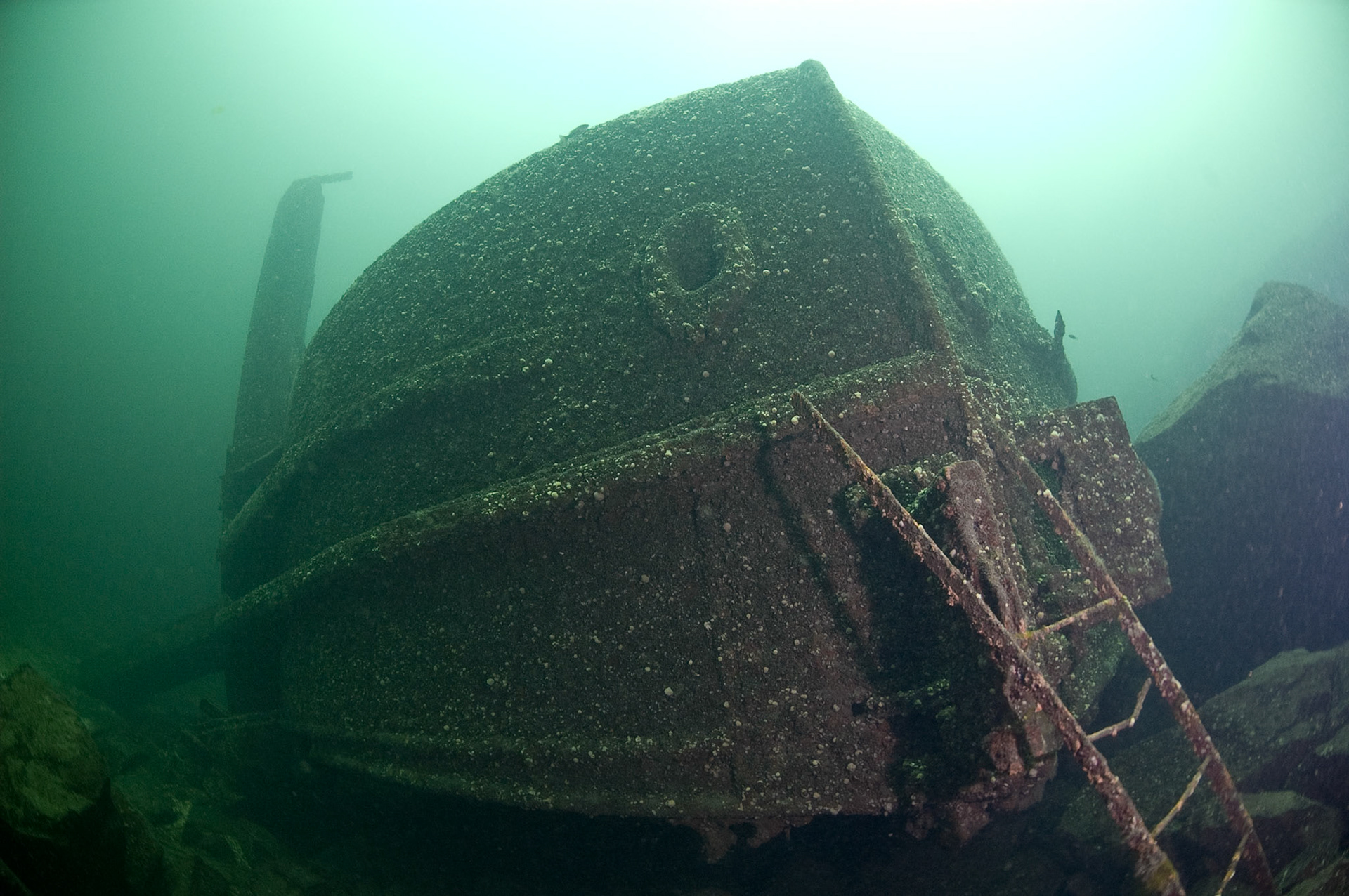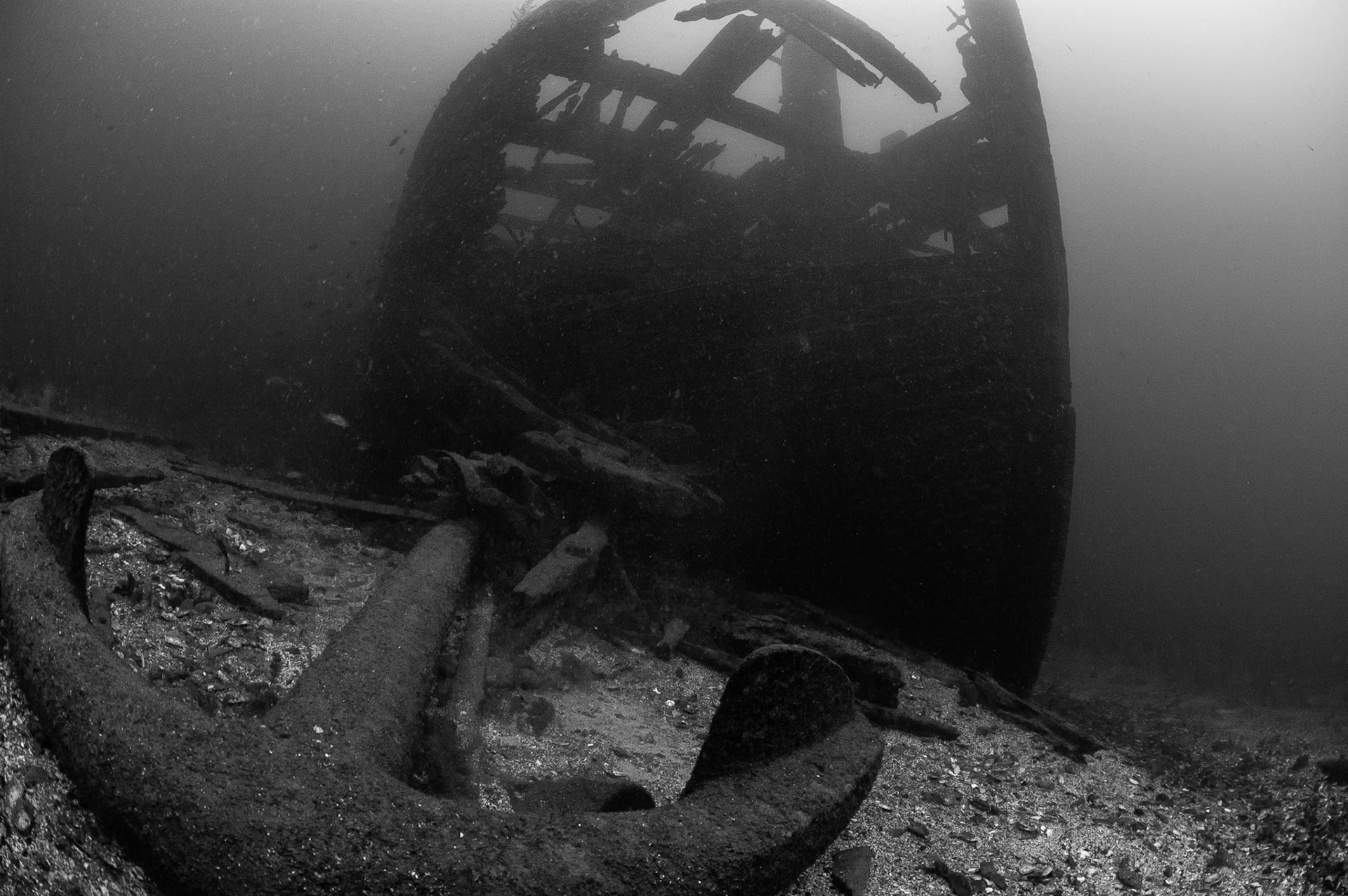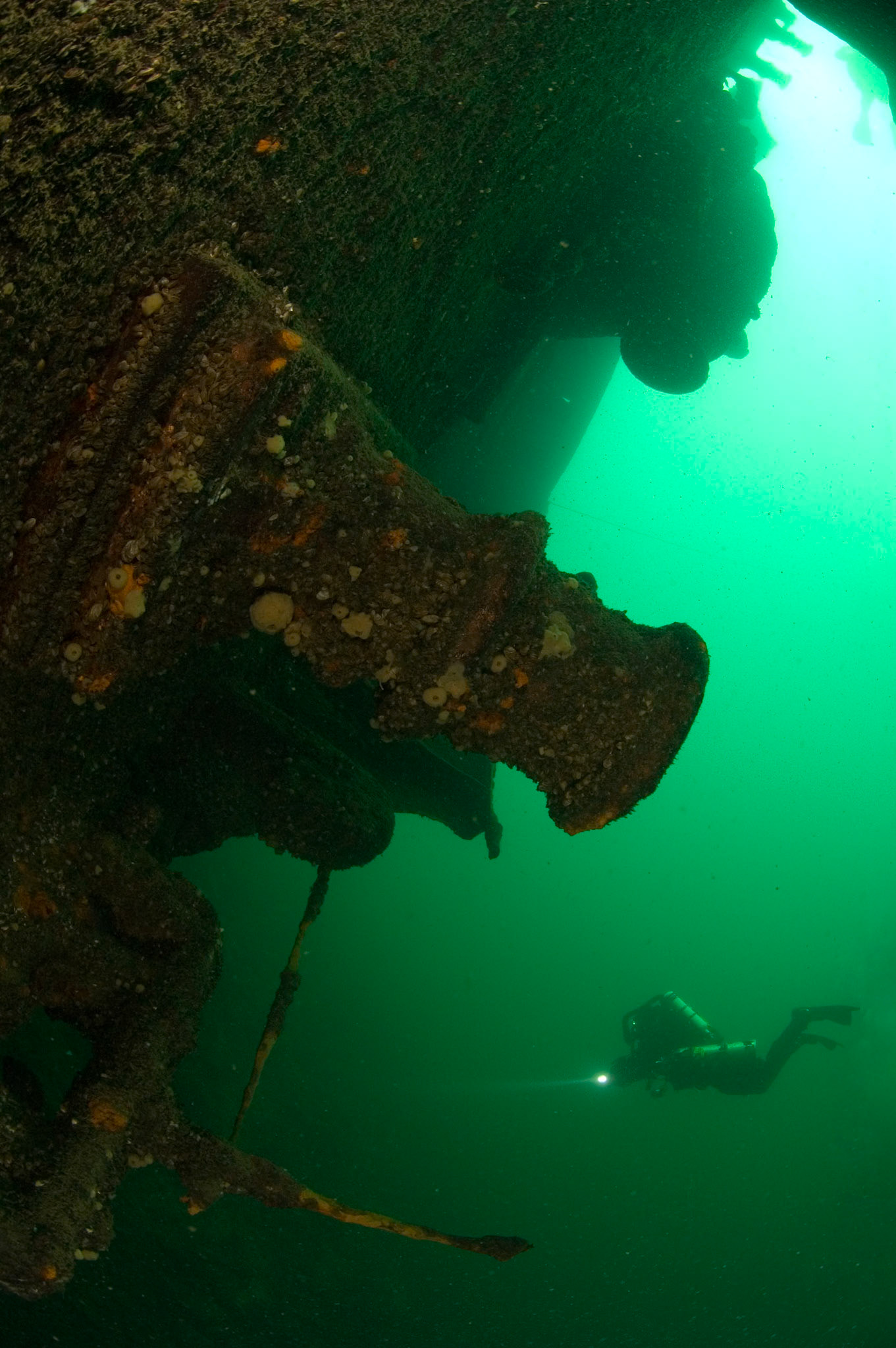 Encore en place, là où elle tournait à grande vitesse, l'hélice du Conestoga est visible sur l'épave. | Still in place, the Conestoga's propeller is now visible on the wreck.
