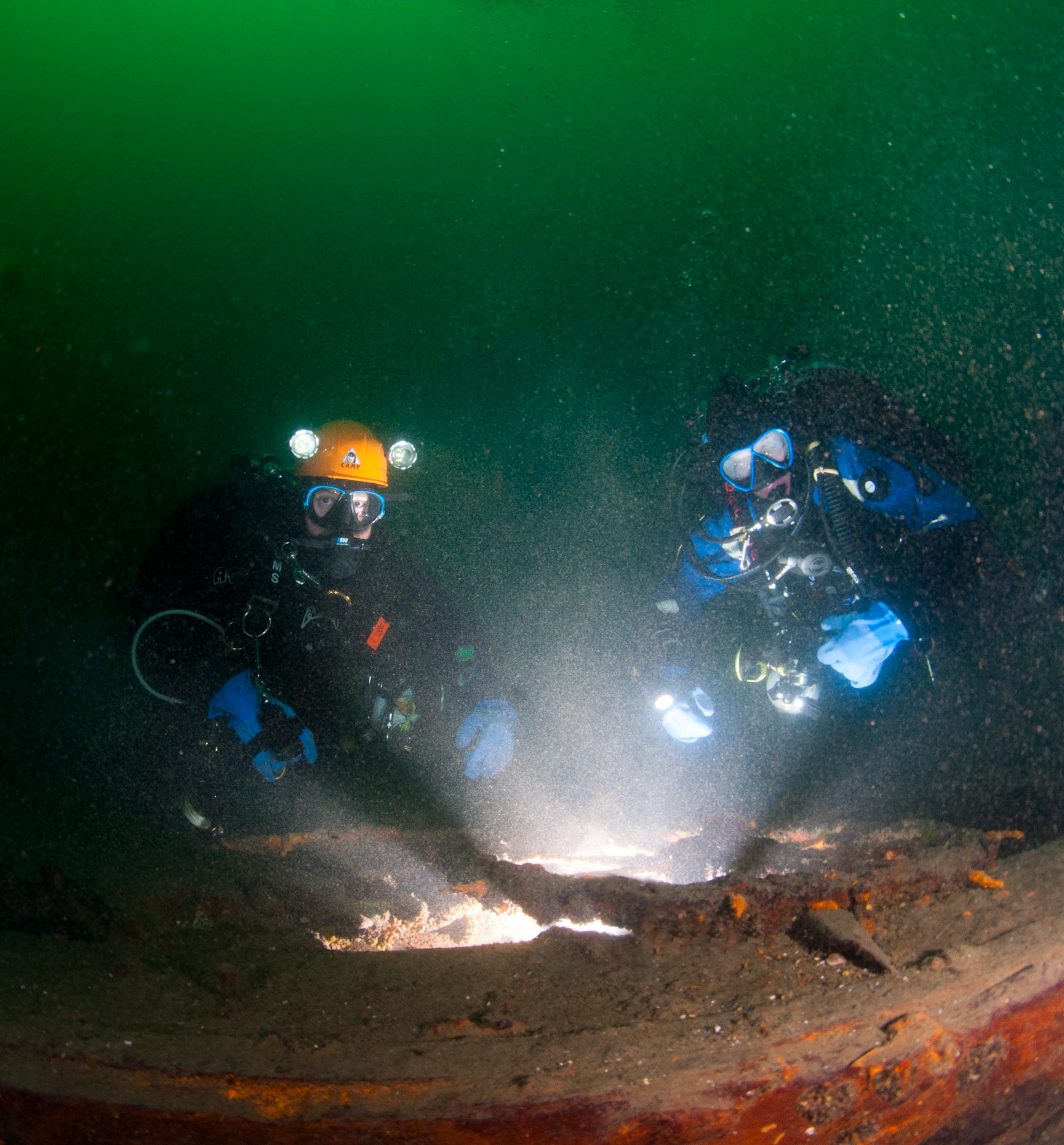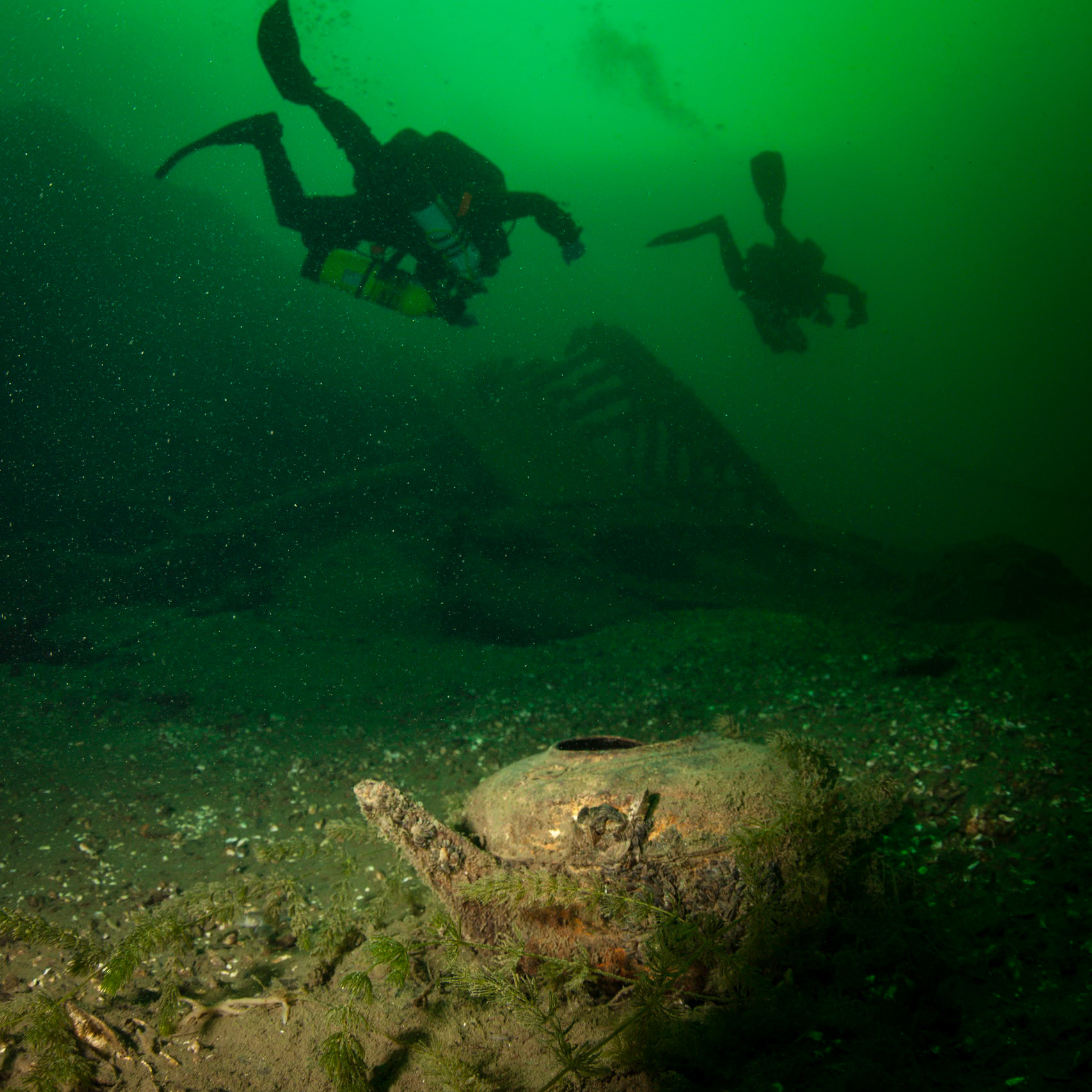 Artefact dans le champs de débris de l'épave. | Artefact found in wreck debris.